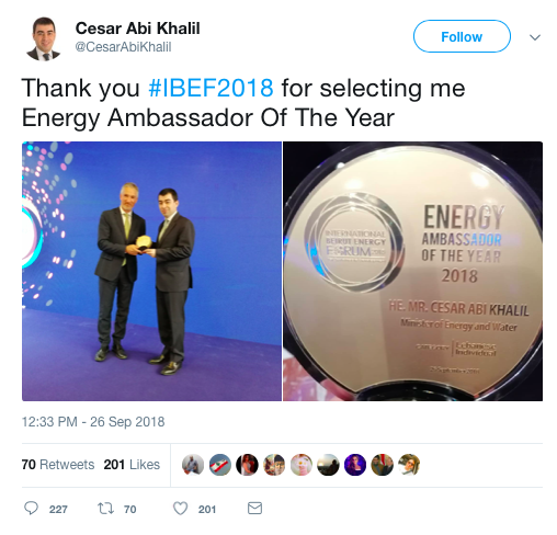 I’ve checked the website of “Beirut International Energy Forum” which issued the medal to Minister Cesar Abi Khalil, but there were no details about the selection process, the jury or the basic criteria that makes candidates eligible. We are only provided with two sentences (that sound almost the same) about this award: