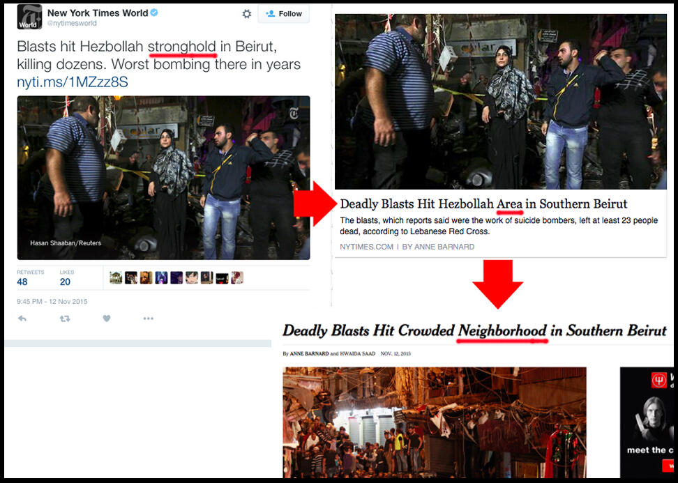A day earlier, when the initial piece was published, complaints began to roll in on Twitter and the first headline changed several times from “Deadly Blasts Hit Hezbollah Area” to “Deadly Blasts Hit Crowded Civilian Area.”