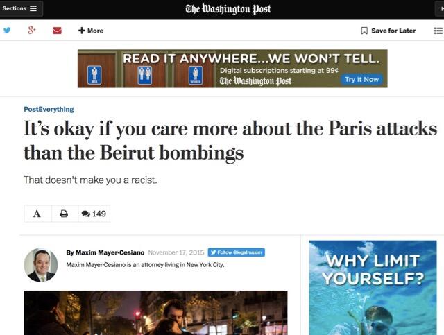 Meanwhile in yet another similar-sounding piece in The Washington Post (“It’s okay if you care more about the Paris attacks than the Beirut Bombings. That doesn’t make you a racist”), a columnist went so far as to suggest that tragedies in the two cities “should not get the same kind of coverage.” The author, a New York City attorney with no listed experience in the Middle East, argued: “Beirut itself has been a war zone several times in the last 30 years…Paris, meanwhile, is usually a safe city.”