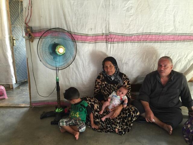 Fawza al Hassan, pictured above with her two little daughters, showed us the bloated stomach and eye problems the 7-year-old girls face. Fawza says she hasn’t been able to get them medical care and cannot even secure her own tent or steady source of food. She relies on the generosity of neighbors for shelter and a bit of rice.